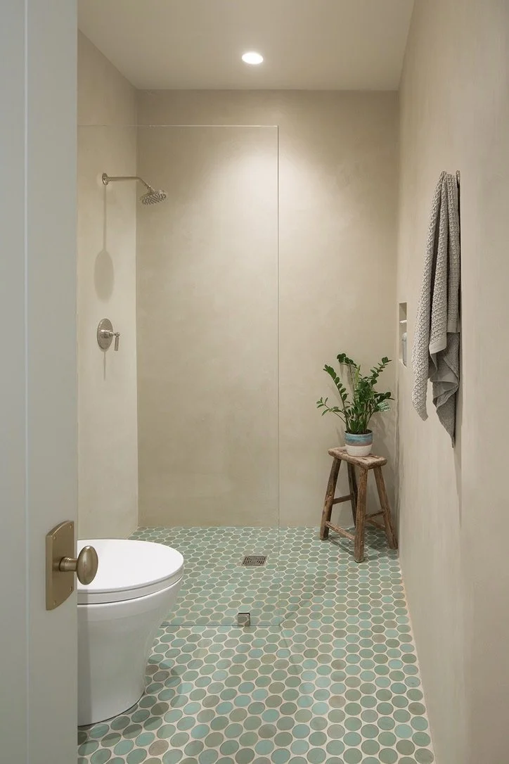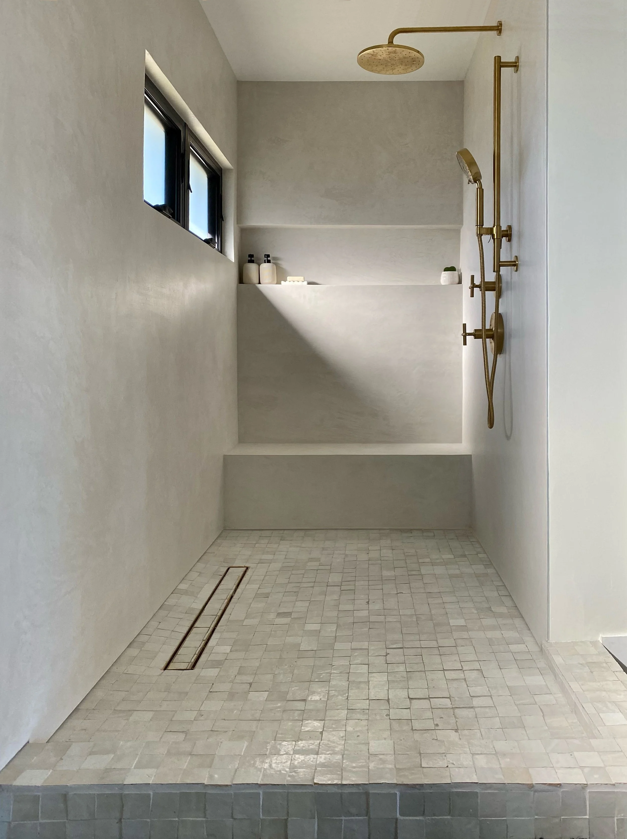 In showers, we install a modernized version of tadelakt based on the ancient Moroccan technique of polished lime plaster. It retains the beauty, sensuousness, and material purity of traditional tadelakt while meeting current building codes.